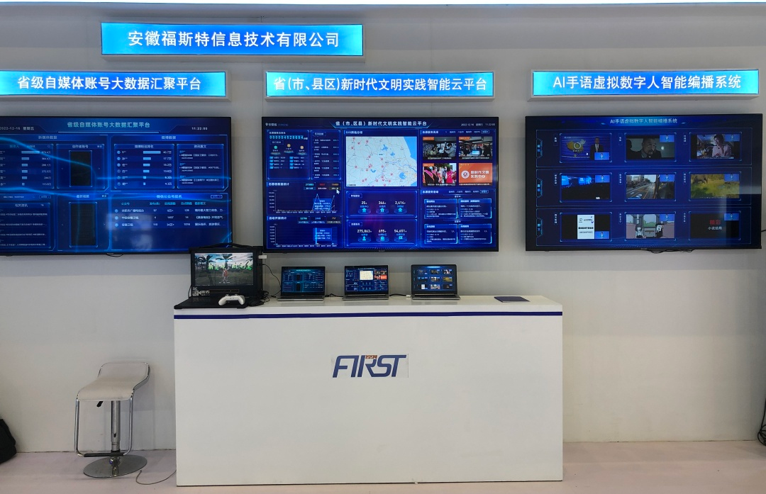 安徽福斯特信息技術(shù)有限公司此次應(yīng)邀參展,以廣電媒體發(fā)展為亮點,集中展示大數(shù)據(jù)、人工智能,呈現(xiàn)了AI-VLOG視頻智能合成系統(tǒng)+AI手語虛擬數(shù)字人智能編播系統(tǒng)+省級自媒體賬號大數(shù)據(jù)匯聚平臺+省(市、縣區(qū))新時代文明實踐智能云平臺技術(shù)。